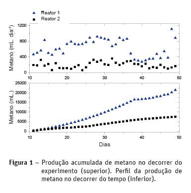 Na Figura 1, pode verificar-se o perfil da produção de metano durante o período de monitorização do reator. Nota-se uma diferença significativa no que diz respeito ao perfil da produção de metano entre os dois reatores. A produção de biogás nem sempre está atrelada à total produção de metano, visto que os micro-organismos não apresentando condições favoráveis, podem produzir maiores concentrações de CO2, como em casos onde a fase da metanogênese-acetoclástica é prejudicada de alguma maneira, como pH e índice de acidez elevados (Balmant, 2009).