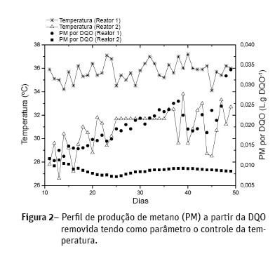 A produtividade no Reator 2 foi muito inferior (330%) ao Reator 1, apesar deste apresentar estabilidade de produção de gás durante os 49 dias de monitorização, enquanto que o reator termicamente controlado apresentou muitas variações bruscas. A relação de produção de metano por DQO alimentada correlacionada com a temperatura pode ser visualizada na Figura 2.