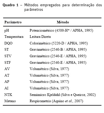 Estipulou-se, para avaliação do trabalho, a realização de três (três repetições) Tempos de Retenção Hidráulica (TRH) de 13 dias, ou seja, avaliação dos reatores durante 39 dias, procurando determinar diferenças na composição da matéria após digestão, nos dois reatores. Este valor foi definido com base no volume útil dos reatores e em carga de entrada de efluente que não fosse muito alta a ponto de proporcionar a lixiviação do inóculo antes da multiplicação das bactérias. Diversas misturas do efluente foram realizadas de modo a determinar a relação ideal de alcalinidade total/acidez volátil, pH dos efluentes e de sua matéria orgânica. Avaliou-se ainda o potencial hidrogeniónico (pH), demanda química de oxigénio (DQO), sólidos totais (ST), sólidos totais voláteis (STV) e sólidos totais fixos (STF), acidez volátil (AV), alcalinidade total (AT), alcalinidade parcial (AP) e alcalinidade intermediária (AI), temperatura e azoto total Kjeldahl (NTK). Todas as análises realizadas no efluente de entrada do reator também foram efetuadas em amostras coletadas na saída deste, tornando possível o estudo, a comparação e a avaliação da eficiência entre ambos os reatores. As metodologias empregues nas análises estão referidas no Quadro 1.