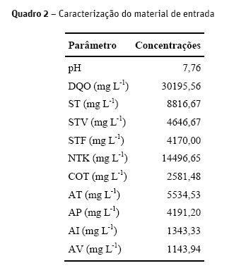 Baseando-se em análises dos dois efluentes definiu-se a mistura dos efluentes em proporções de suíno:vinhaça e analisou-se o material, verificando-se quais seriam as condições de entrada da biomassa a ser digerida. Os resultados das análises estão descriminados no Quadro 2.