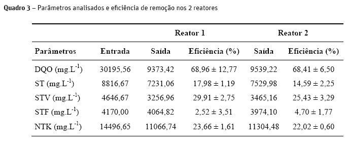 No Quadro 3 apresentam-se as eficiências de remoção de DQO, sólidos e azoto total.