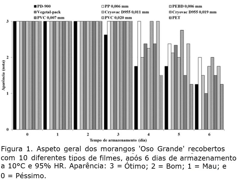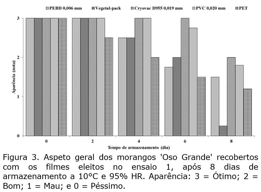 Os frutos acondicionados nas caixas PET cobertos com o filme de PP 0,006 mm e o Cryovac® D955 termoencolhivel de 0,019 mm de espessura apresentaram ao sexto dia, a pontuação mais elevada (Nota 2) Bom, enquanto os acondicionados com o filme Vegetal-pack® com 0,018 mm obtiveram nota 1 - Mau (Figura 1). A fraca pontuação atribuida ao produto embalado com Vegetal-pack® deveu-se à condensação de vapor de água no seu interior. Esta condensação de água foi originada pela diferença de pressão de vapor entre o produto e a camâra de armazenamento, pondo em evidência que a pré-refrigeração por 2 horas a 10 ºC não foi o suficiente. Segundo Malgarim et al. (2006) o pré-arrefecimento precisa ser de 1 hora a -3 ºC, até que a temperatura da polpa dos morangos atinja 4 °C, contudo, não se utilizou esta temperatura pois não representa a realidade da cadeia produtiva nacional.