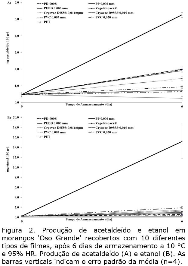 A embalagem PET com tampa perfurada não apresentou alterações na sua atmosfera, durante o período de armazenamento, mantendo as concentrações de O2 (19,7 kPa) e de CO2 (0,09 kPa). As embalagens com o filme de polipropileno (PP) apresentaram a maior alteração na composição gasosa, com aumento do teor de CO2 para 30,3 kPa e redução de O2 para 0,42 kPa, durante o período de armazenamento. Os frutos acondicionados em PP apresentaram ao fim de seis dias boa aparência (Figura 1), contudo com odor alcóolico, perceptível no seu interior, comprovado pelos maiores teores de acetaldeído (Figura 2A) e de etanol (Figura 2B). A redução do teor de O2 (0,4 kPa) e aumento do CO2 (30,3 kPa) desencadeou a ativação do sistema de respiração anaeróbica com redução de energia a nível celular, como indicado por Watkins et al. (1999).