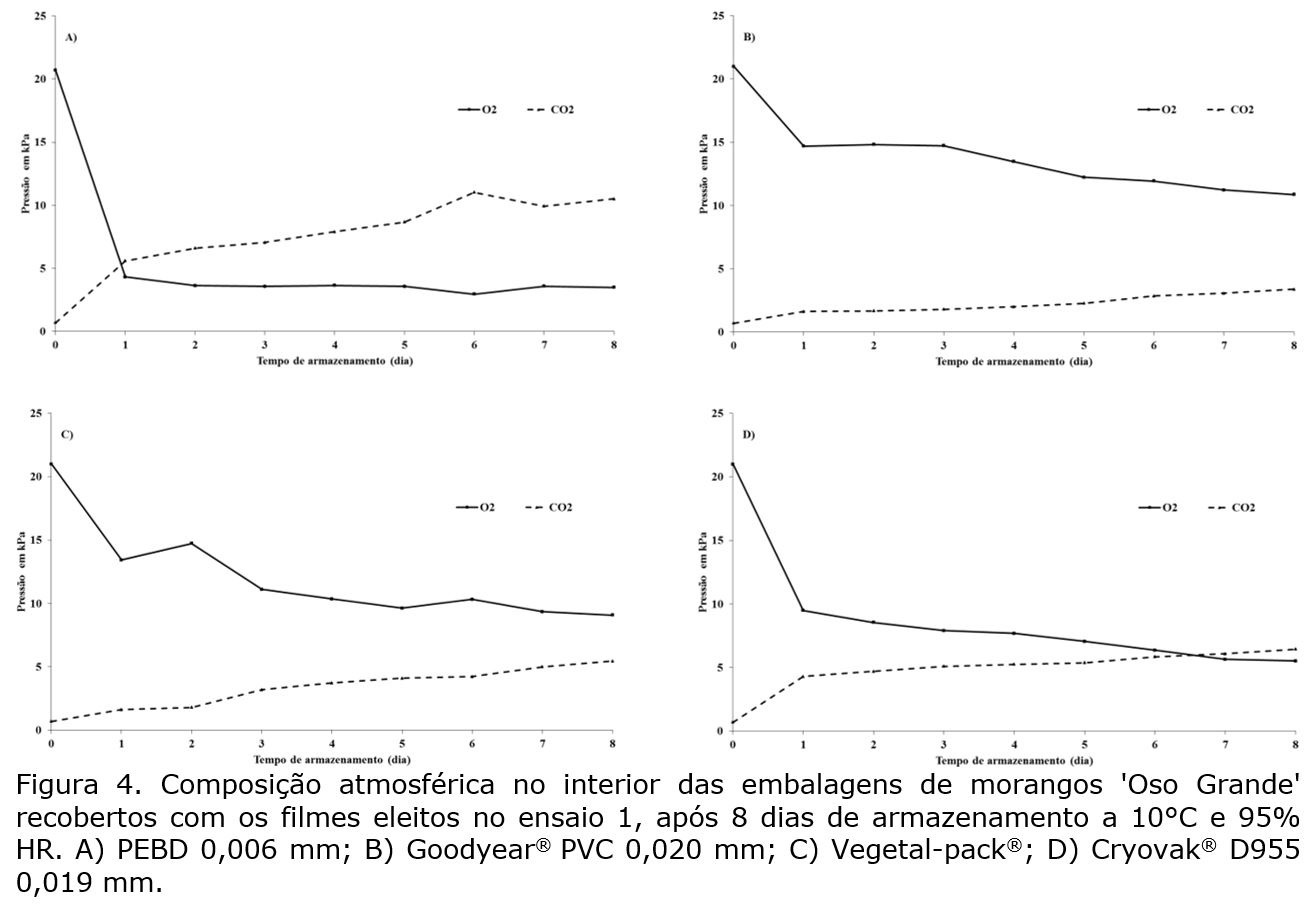O filme de PVC de 0,020 mm de espessura evidenciou baixa barreira aos gases atmosféricos, reduzindo a concentração de O2 para valores de 11,82 kPa e aumentando a de CO2 para 3,0 kPa, no seu interior, durante o período de armazenamento (Figura 4B). A caixa recoberta com o filme Vegetal-pack® apresentou efeito semelhante à recoberta com o filme PVC, apresentando o mesmo valor para o teor de O2, enquanto para o teor de CO2, 5,25 kPa, duplicou o valor (Figura 4C). A amostra correspondente à caixa revestida com o filme D955® também sofreu um aumento na concentração de CO2 e uma redução no teor de O2, na atmosfera interna das embalagens, que no final do período de armazenamento era de 6,45 kPa de CO2 e 5,52 kPa de O2 (Figura 4D).