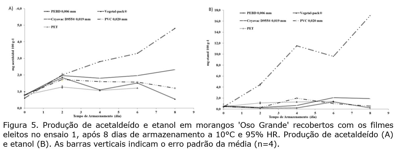 Os morangos revestidos com os filmes Vegetal-pack® e PVC apresentaram teores de acetaldeído e etanol (Figuras 5A e 5B) semelhantes aos encontrados nos frutos da caixa coberta com tampa PET perfurada. A caixa com o filme D955® proporcionou um aumento no teor de acetaldeído e etanol dos morangos, enquanto a caixa com PEBD foi a que evidenciou os teores mais elevados de acetaldeído e etanol (Figuras 5A e 5B), contudo, não provocaram o aparecimento de odor alcoólico nos frutos.