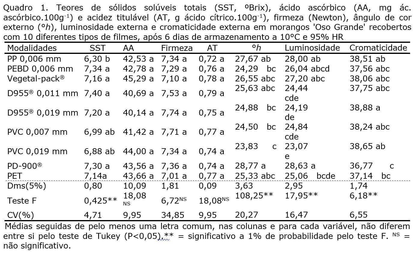Os teores de ácido ascórbico e acidez titulável e os valores de firmeza não apresentaram diferenças significativas entre as diferentes modalidades ao sexto dia (Quadro 1). Contudo, observou-se um mais elevado teor de SST nos morangos acondicionados com o filme PP (Quadro 1), e tal facto pode ser reflexo da baixa taxa de energia despendida na respiração anaeróbica, consumindo maior teor de hidratos de carbono na produção de energia (Deuchande et al., 2016). Os filmes utilizados influenciaram os parâmetros que caracterizam a cor externa dos morangos, porém não percetível visualmente (Quadro 1), o que também foi relatado por Brackmann et al. (2001) em armazenamento de morangos à temperatura de 20 ºC.