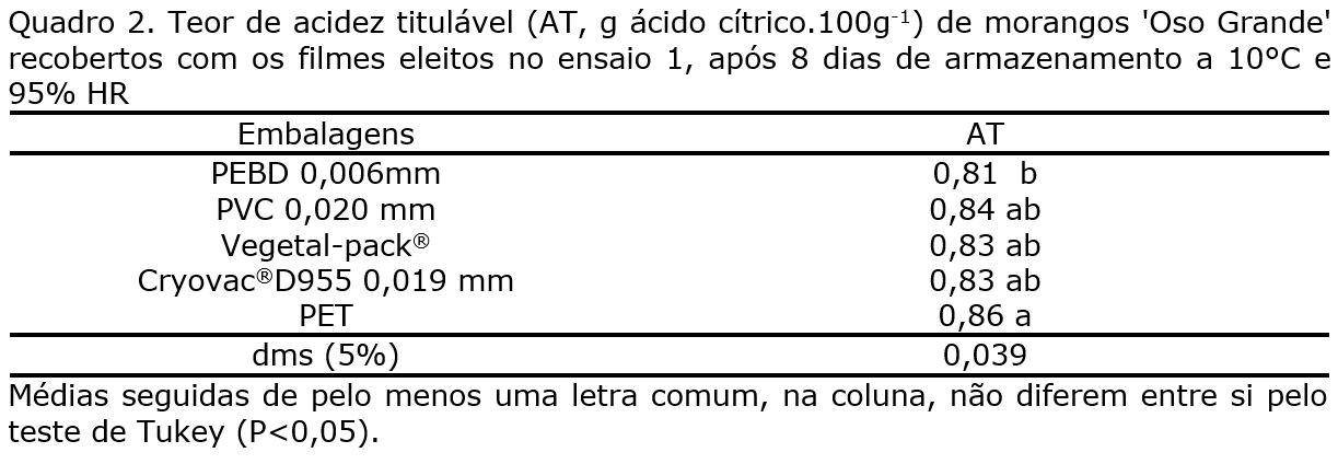 A perda de massa fresca nos morangos em caixas PET cobertos com os diferentes filmes plásticos foi inferior a 0,5%, sendo aproximadamente dez vezes menor que a dos frutos acondicionados em caixas PET com tampa perfurada, em que a redução da massa inicial foi de 4,5%. Uma vez que os filmes plásticos apresentam barreira ao vapor de água (Kader et al., 1989), mantêm elevada humidade relativa no ambiente interno das embalagens, que implica uma insignificante perda de massa fresca (Sarantópoulos et al., 1996).