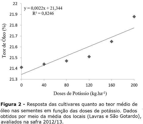 A maior disponibilidade de potássio, com o aumento nas doses, propiciou alteração na composição química das sementes com incremento no teor de óleo.