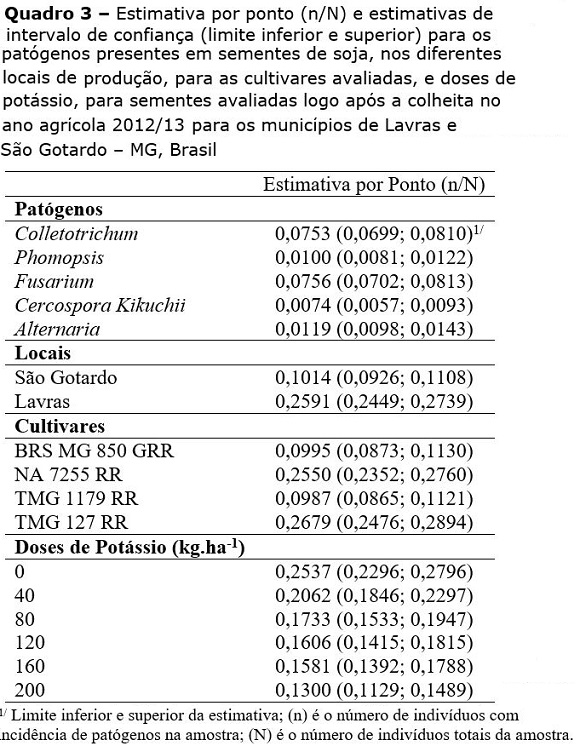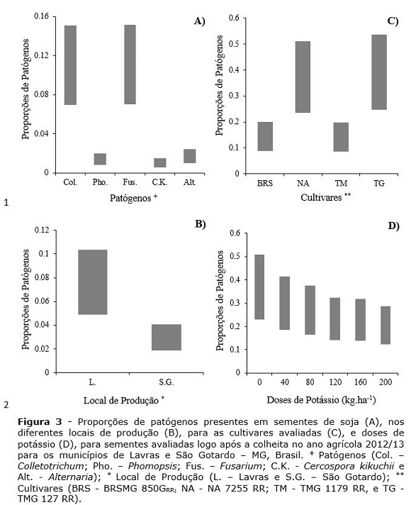 Na avaliação sanitária das sementes foram identificados a incidência de Colletotrichum sp., Phomopsis sp., Fusarium sp., Alternaria sp. e Cercospora kikuchii. As proporções de patógenos considerando todos os locais de produção, de acordo com a análise de intervalo de confiança, destacam maior presença de Colletotrichum sp. e Fusarium sp. (Figura 3A e Quadro 3).