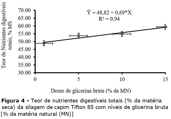 A inclusão de 15% de GB na silagem de capim Tifton 85 aumentou 4,3% o teor de carboidratos totais (CT) em relação à silagem controle (81,5%). Entre os níveis, não foi verificada diferença (P>0,05) para os teores de CT com média de 83,4%. Os teores de nutrientes digestíveis totais (NDT) foram influenciados com a aplicação de GB. Houve aumentos de 11,1%, 19,2%, 20,8% e 26,8% quando se adicionou 1%, 5%, 10% e 15%, respectivamente em relação à silagem controle (43,4%). Na Figura 4 pode ser verificado que com o aumento de 1% de GB para 15% durante a ensilagem de capim Tifton 85, houve incremento de 17,7% no teor de NDT, sendo reportado incremento de 0,7% nos níveis de energia para cada quilograma de GB aplicado.