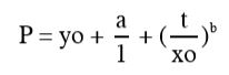 em que P é o peso médio de grãos (mg), t é o tempo em dias após a antese, e y0, a, b, x0 são coeficientes determinados pela regressão. A duração do período de enchimento de grãos foi obtida quando o P estava entre 5% (t1) até 95% (t2) do peso final de grão. A subtração do peso médio de grãos (P) pelo tempo em dias após a antese (t), fornece a taxa de acúmulo de matéria seca no grão entre o t1 e t2, a partir disso, foi calculada a taxa máxima de enchimento de grão. Similarmente, o período utilizado para calcular a soma térmica acumulada e a radiação solar acumulada no efetivo período de enchimento de grão foi entre o t1 e t2 estimado pela equação acima para cada cultivar e data de semeadura.