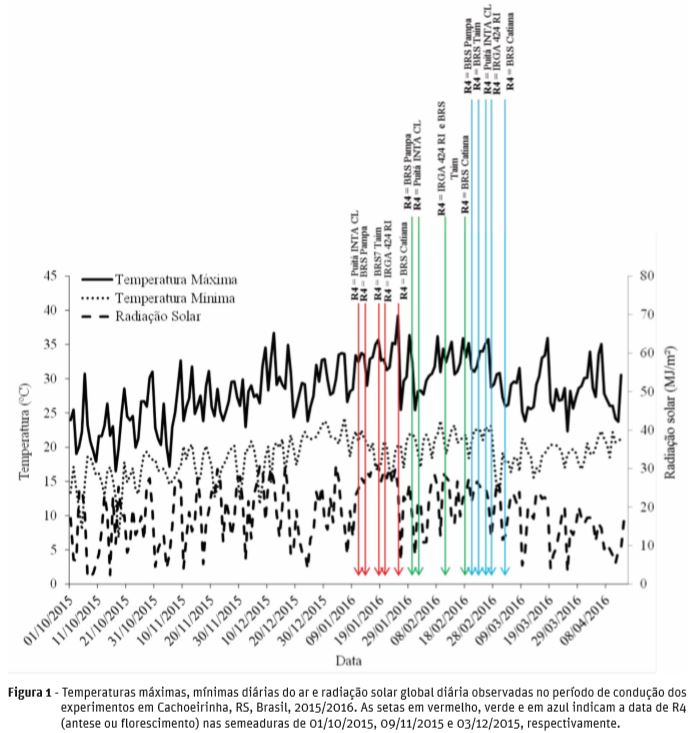 Os dados de temperatura máxima, mínima e radiação solar no período de condução dos experimentos estão descritos na Figura 1. O período de florescimento dos cinco genótipos variou de 71-103 dias após a emergência, como representado pelas setas. A radiação solar apresentou uma variação significativa durante o período de enchimento de grãos nas cinco cultivares em cada época de semeadura.