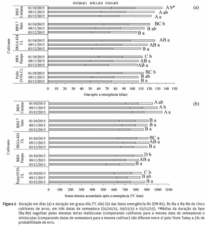 A diminuição do ciclo de desenvolvimento deve-se principalmente à temperatura do ar, que aumentou de outubro para dezembro, e promoveu a redução do período vegetativo de 8 a 16 dias entre as cultivares, nas semeaduras de novembro e dezembro em relação a de outubro (Figura 2a). A duração da fase vegetativa (EM-R1) foi a que mais variou em relação ao ciclo total, entre as épocas de semeadura, principalmente nas cultivares BRS Catiana e IRGA 424 RI (Figura 2a). Carli et al. (2016) verificaram uma redução similar (9 a 13 dias) na duração da fase vegetativa em arroz irrigado com o atraso da época de semeadura de outubro para dezembro.