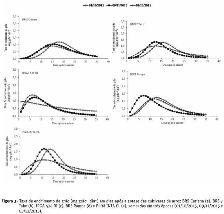 Com relação a taxa máxima de acúmulo de matéria seca, foi observado que a cultivar Puitá INTA CL apresentou o maior valor absoluto (1,7 mg grão-1 dia-1) para a semeadura de novembro, enquanto que as cultivares BRS Catiana e IRGA 424 RI apresentaram os menores valores (0,9 mg grão-1 dia-1) para a data de semeadura dezembro e outubro, respectivamente (Figura 3, Quadro 1). Isso indica que (com exceção da cultivar IRGA 424 RI semeada em outubro)  a antecipação da época de semeadura promoveu um atraso no período de ocorrência da maior taxa de enchimento de grãos (Figura 3), o que pode ser atribuído a menor temperatura média do ar (Figura 1) que as plantas foram expostas na primeira época de semeadura, que afeta diretamente a atividade das enzimas que participam da deposição de amidos no grão (Nakamura et al., 1989).