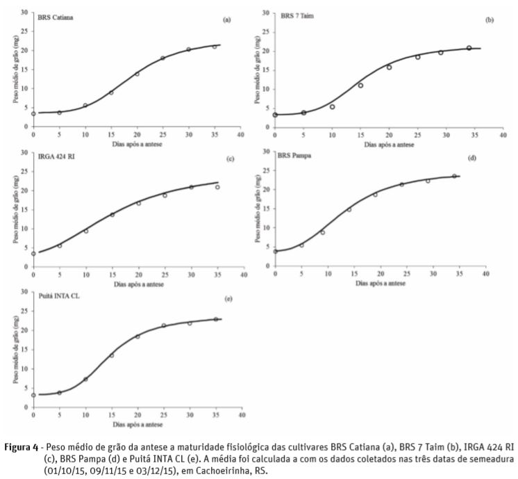 Desta forma, a equação de regressão não linear pode ser utilizada para predizer a maturidade fisiológica e o peso médio de grãos em um determinado instante do tempo (dias) até a maturidade completa dos grãos na panícula para as cultivares BRS Catiana, BRS 7 Taim, IRGA 424 RI, BRS Pampa e Puitá INTA CL 5 (Figura 4). Com isso, foi identificado que as cinco cultivares avaliadas neste trabalho mostraram diferentes respostas quanto às caracteristicas de taxa de acúmulo de materia seca e duração do período de enchimento de grãos.