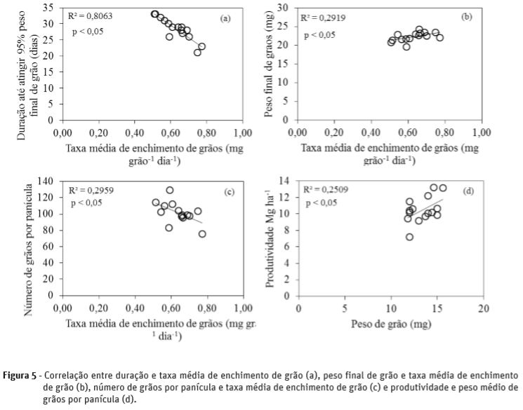 Na Figura 5, pode ser observado que o número de grãos panícula-1, peso médio de grão em R9 e duração do enchimento de grão foram altamente correlacionados com a taxa média de enchimento de grão. Estes resultados estão de acordo com os observados por Yang et al. (2008), indicando que à medida que aumenta a taxa média de enchimento de grão, aumenta o peso médio de grãos, diminui a duração do enchimento de grão e o número de grão por panícula. Além disso, o peso médio de grão também apresentou correlação com a produtividade de grãos (Figura 5), confirmando o resultado observado por Jones et al. (1979). Assim, verifica-se que a taxa média de enchimento de grãos foi mais importante do que a duração do enchimento de grãos.