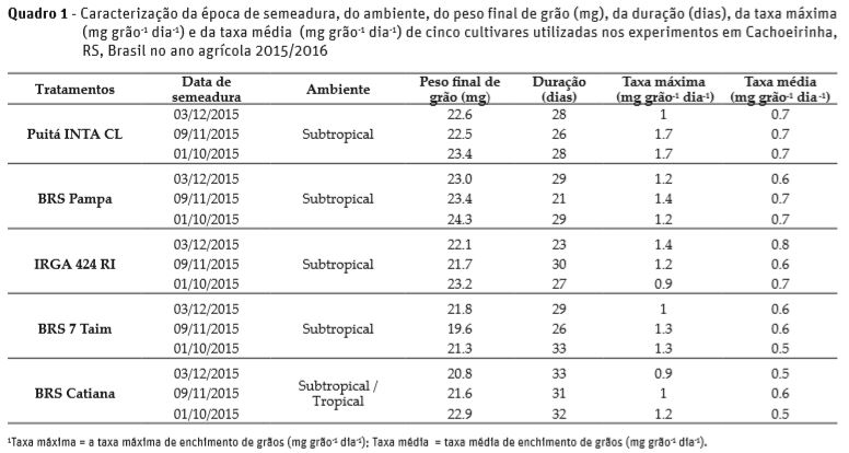 Entre as cultivares, a cultivar BRS 7 Taim foi  a que apresentou o menor peso médio de grãos em R9 (19,6 mg) e a cultivar BRS Pampa o maior (24,3 mg), o que indicou que uma alta taxa máxima de acúmulo de matéria seca (acima de 1), não corresponde, necessariamente, a um maior peso de grãos, pois uma taxa alta em um curto período de enchimento de grãos (menor que 26 dias) pode resultar em um baixo peso médio dos grãos em R9, como foi observado na cultivar de ciclo tardio BRS 7 Taim semeada em novembro (Quadro 1) e em estudos realizados com a cultura do trigo (Aude et al., 1994).