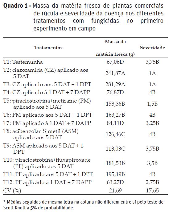 Clubroot (Plasmodiophora brassicae Woronin) is a disease that attacks all brassicaceae and that can make their cultivation unfeasible. The objective of this research was to evaluate the efficiency of 3 fungicides with physiological effect, and one resistance inducer product that lessens the reproduction of Plasmodiophora brassicae in the cultivation of rocket in a naturally infested field. Two experiments were conducted in a random experimental design, with four replications. In the first, the treatments were composed by the application of the three fungicides, Cabrio TopÒ (metiram+pyraclostrobin), OrkestraÒ (pyraclostrobin+fluxapiroxade) and RanmanÒ (cyazofamide) and a resistance inductor inductive, BionÒ (acibenzolar-S-methyl). The best treatments were evaluated in a second experiment, besides other doses for the fungicides Cabrio TopÒ and OrkestraÒ. The treatments were applied to the tray five days before the transplantation, five days before the transplantation, besides a foliar application one day after transplantation and two foliar applications, the first one day after transplantation and the second seven days after the first. The cyazofamide application was the most efficient in the management of clubroot. The metiram+pyraclostrobin was another efficient fungicide that can be used to manage the disease. The application of these products must be done in a preventive way.