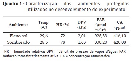 As características do metabolismo fotossintético das plantas de P. aculeata foram avaliadas em mudas propagadas por estacas de diferentes posições no ramo, sendo elas do tipo apical, mediana e basal. As mudas foram produzidas sob duas disponibilidades luminosas: pleno sol e sombreamento (cobertura plástica + tela de polipropileno preto de 50% de retenção do fluxo de radiação solar), cujas características são encontradas no Quadro 1. Os dados de déficit de pressão de vapor de água foram calculados considerando a temperatura e humidade relativa de cada ambiente, segundo proposta de Sandler & Evans (1989).