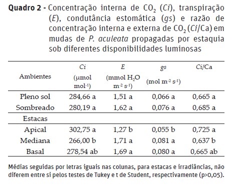 A eficiência do uso da água foi menor nas folhas das mudas provenientes de estacas apicais expostas a alta irradiância (Quadro 3), o que pode ser atribuído à maior desidratação do tecido vegetal em função do menor diâmetro da estaca, isto é, de material de reserva para manutenção da turgescência.