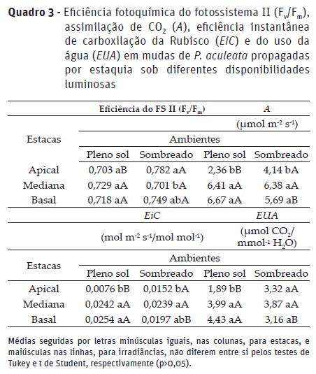 A menor eficiência de carboxilação da Rubisco leva à menor assimilação de CO2 representada pela elevação do Carbono interno (Ci) (Quadro 2), reduzindo a capacidade fotossintética (Quadro 3) das mudas de P. aculeata. Assim, observa-se que as estacas medianas apresentam maior eficiência de carboxilação (EiC) e capacidade fotossintética (A) tanto no cultivo a pleno sol quanto sob sombreamento, com valores que não variaram significativamente das estacas basais nos dois regimes de luz. Ressalta-se que maior capacidade fotossintética é uma característica desejável uma vez que a maior produção de fotoassimilados garante maior crescimento e desenvolvimento das mudas.