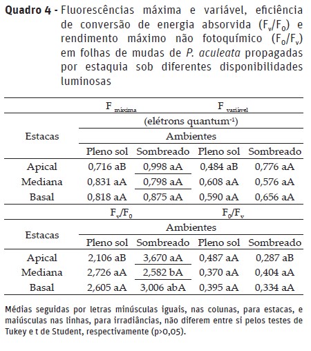 Quanto à fluorescência variável, eficiência efetiva de conversão de energia absorvida (Fv/F0) e quântica potencial fotoquímica do FS II (Fv/Fm), verificou-se menores valores nas mudas de estacas apicais sob alta irradiância (Quadro 5), diferindo-se estatisticamente das mudas sombreadas, utilizando-se o mesmo tipo de estaca. Os maiores valores em ambiente sombreado devem-se a maior quantidade de clorofilas, isto é, ocorre transporte de forma sincronizada e eficiente, considerando-se como mecanismo de estratégia para evitar valores muito baixos de fotossíntese diária por área foliar (Díez et al., 2017).
