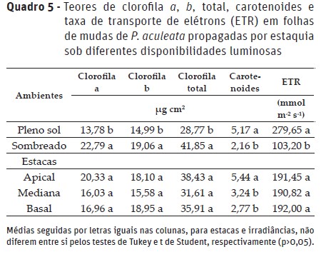 Os teores de pigmentos fotossintéticos foram influenciados apenas pelos contrastes de irradiância. Independente do tipo de estaca constatou-se maiores teores de clorofila a, b e total nas mudas sombreadas (Quadro 5), e os carotenoides e a taxa de transporte de elétrons apresentaram-se em maior concentração nas folhas das plantas cultivadas a pleno sol.