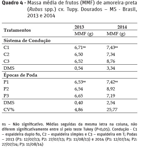 Apenas no segundo ano de produção (2014), a condução 3 (espaldeira em T) e a época de poda 2 (27/07/14) cujas as massas foram 8,76g e 8,92g (Quadro 4), respectivamente, apresentaram massa média de fruto dentro do que se espera para a cultivar (‘Tupy’), que varia de 8 a 10g (Antunes et al., 2014). Os valores ficaram acima dos encontrados por Figueiredo et al. (2013) para a cultivar Tupy em Lavras-MG.