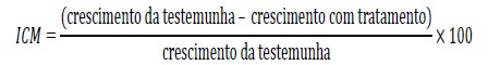 A partir das medições calculou-se a taxa de inibição de crescimento miceliar (ICM), conforme fórmula descrita por Hillen et al. (2012):