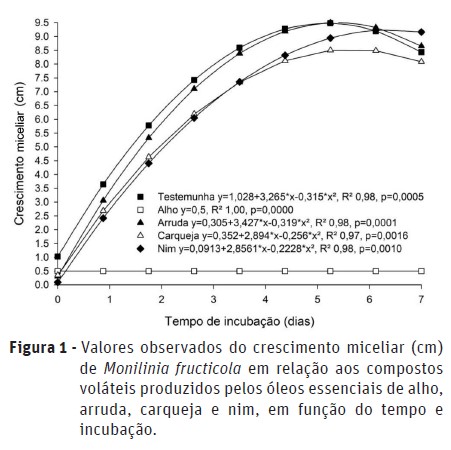 Em relação aos compostos voláteis presentes no óleo de arruda, pode-se observar que ocorreu o controle de desenvolvimento do fungo nos dois primeiros dias, e entre o terceiro e quinto dia estimulou o crescimento, sendo superior à testemunha, fato que também ocorreu com o óleo de nim no quinto dia, sendo que os compostos voláteis destes óleos como o de carqueja não diferiam da testemunha, que possuía apenas o meio BDA.