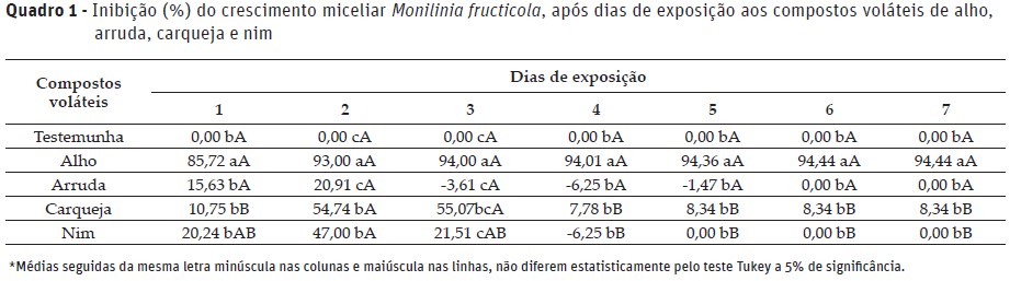 Os tratamentos com óleo essencial de alho obtiveram efeito anti-microbiano, inibindo completamente o crescimento miceliar de M. fructicola em meio de cultura BDA, diferindo dos demais tratamentos durante todo o período (Figura 1 e Quadro 1). Os óleos essenciais são constituídos por substâncias que podem apresentar propriedades fungistáticas ou fungicidas (Antunes e Cavaco, 2010). No caso do alho, existem alguns trabalhos que comprovam a eficácia dos compostos presentes no óleo para o controle de Phytophthora cactorum, Cryponectria parasitica e Fusarium circinatum, que incidem sobre plantas da família Myrtaceae (Lee et al., 2008). Segundo El-Moghazy et al. (2017) o óleo de alho aplicado com uma dosagem de 6% inibiu o crescimento de Cephalosporium maydis em 98,35%.