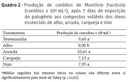 Ainda, quanto à inibição da esporulação de M. fructicola, obteve-se resultados semelhantes ao crescimento miceliar (Figura 1). Os compostos voláteis presentes no óleo essencial de alho atuam de forma eficiente, evitando totalmente a esporulação do patogénio. Em contrapartida, os compostos voláteis presentes nos demais óleos essenciais não diferiram da testemunha que possuía apenas meio de cultura BDA (Quadro 2).