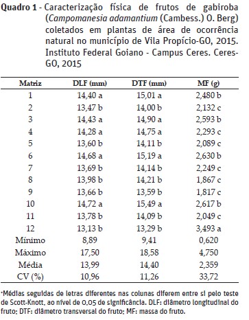 Os frutos de gabiroba apresentaram valores médios de diâmetro longitudinal (DLF), diâmetro transversal (DTF) e massa do fruto (MF), respectivamente, de: 13,99 mm; 14,40 mm e 2,359 g (Quadro 1). As amplitudes de variação, mínima e máxima, apresentadas pela gabiroba para as variáveis de fruto avaliadas (Quadro 1) corroboram com os valores encontrados por Dresh et al. (2013), que obtiveram valores de diâmetro longitudinal variando de 12,71 mm a 22,74 mm e diâmetro transversal variando de 12,46 mm a 21,36 mm, em estudo com subpopulação em Ponta Porã-MS. Melchior et al. (2006), também encontraram valores próximos ao do presente trabalho, com comprimento longitudinal dos frutos de 14,00 mm a 22,00 mm. As matrizes que apresentaram maiores diâmetro longitudinal e transversal do fruto foram 1, 3, 4, 6 e 10.