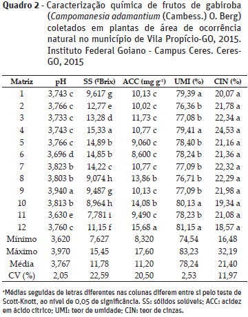 O pH dos frutos de gabiroba (Quadro 2) apresentou valor médio (3,767) inferior ao encontrado por Vallilo et al. (2006), em estudo com frutos de gabiroba coletados em diferentes estádios de amadurecimento na Floresta Estadual de Assis-SP, que foi 4,300. A matriz 9 apresentou valor de pH médio superior (3,940) e a matriz 11 valor inferior (3,630) às demais matrizes. O pH é importante na determinação do potencial de crescimento de microrganismos patogênicos capazes de provocar deterioração nos alimentos.