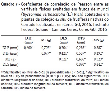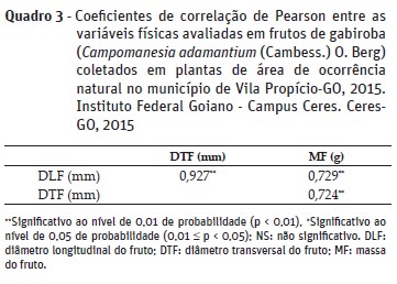 Houve correlação significativa de média a alta magnitude entre as variáveis: diâmetro longitudinal do fruto e diâmetro transversal do fruto (0,600); diâmetro longitudinal do fruto e massa do fruto (0,707); diâmetro longitudinal do fruto e diâmetro longitudinal da semente (0,704); diâmetro transversal do fruto e massa do fruto (0,877); e diâmetro longitudinal da semente e massa da semente (0,642) (Quadro 7).