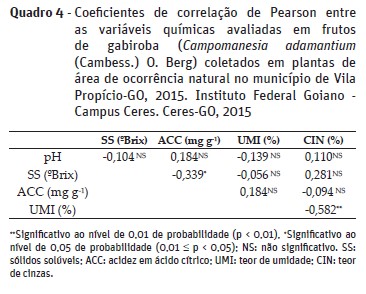 As variáveis, diâmetro longitudinal do fruto, diâmetro transversal do fruto e massa do fruto apresentaram valores de correlação significativos e altos entre si (Quadro 3), o que demonstra que há uma dependência de uma variável em função de outra. Para os caracteres químicos, houve correlação significativa e inversamente proporcional entre sólidos solúveis e acidez em ácido cítrico (-0,339) e entre umidade e teor de cinzas (-0,582), no entanto, estes valores são de baixo a médio, denotando uma fraca correlação (Quadro 4).