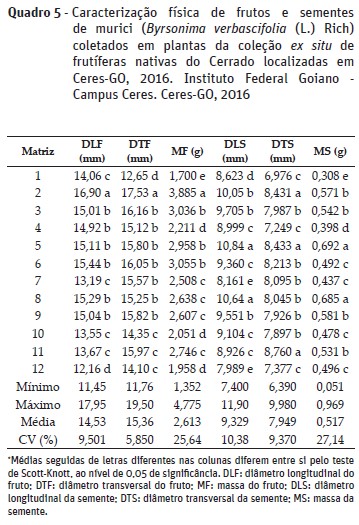 A espécie B. verbascifolia (Quadro 5) apresentou uma alta variação fenotípica intrapopulacional, visualizada por meio das características físicas avaliadas em frutos e sementes, o que provavelmente pode estar relacionado à variabilidade genética existente entre as plantas da subpopulação avaliada. A variação entre matrizes dentro de subpopulação tem sido observada em trabalhos com frutíferas nativas do Cerrado (Ganga et al., 2009). Os valores médios de diâmetro longitudinal, transversal e massa de frutos de murici foram, respectivamente, 14,53 mm, 15,36 mm e 2,613 g. Estes valores assemelham-se aos encontrados por Gusmão et al. (2006), que também avaliaram frutos desta espécie na região de Montes Claros-MG.