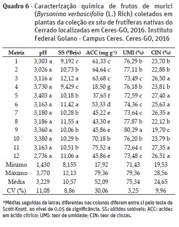 O valor médio para acidez em ácido cítrico (ACC) e umidade (UMI) apresentado pelos frutos de gabiroba foi, 11,20 mg g-1 e 78,24%, respectivamente. O CV (%) registrado para a acidez em ácido cítrico foi o segundo maior entre as variáveis químicas avaliadas (Quadro 2). A matriz 12 apresentou o maior valor médio (15,68 mg g-1) para ACC.
