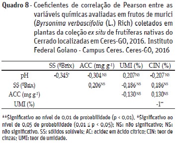 As variáveis químicas do murici, umidade e teor de cinzas, apresentaram correlação significativa e de alta magnitude (-1) (Quadro 8). Isso indica que, quanto maior a umidade nos frutos menor será o teor de cinzas e vice-versa.
