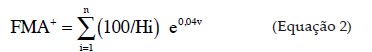 em que: FMA+ = Fórmula de Monte Alegre modificada; Hi = umidade relativa do ar (%) mediada as 13h; v = velocidade do vento em m/s, medida às 13h; n = número de dias sem chuva maior ou igual a 13 mm; e = base dos logaritmos naturais (2,718282).