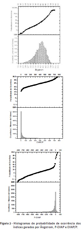 Os índices de Ängstrom, P-EVAP e EVAP/P não possuem classificação de perigo de incêndio, deste modo foi aplicado o método dos histogramas de probabilidade (Figura 2), o qual representam a frequência de ocorrência dos valores em relação a sua probabilidade de incêndios.