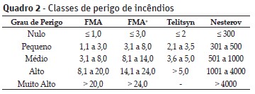Os índices padrões utilizados no Brasil são o FMA e FMA+, por esse motivo no Quadro 4 estão apresentadas as distribuições em percentual de dias nas diferentes classes de perigo de incêndio desses índices.