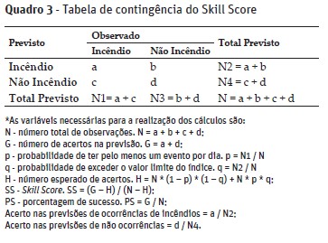 Para calcular o Skill Score considerou-se os valores dos índices nas classes de risco IV e V (alto e muito alto), como dias previstos para ocorrência de incêndio, e as demais classes de risco (I a III) para previsão de não ocorrência de incêndios. Os valores dos dias observados com ocorrência ou não de incêndios foram extraídos da base de observações de focos de calor do Banco de Dados de Queimadas (BDQueimadas) do Centro de Previsão do Tempo e Estudos Climáticos (CPTEC; http://pirandira.cptec.inpe.br/queimadas/) - (CPTEC, 2012).