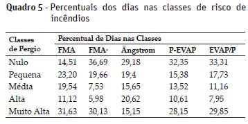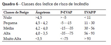 Com a nova classificação, foram distribuído os percentuais de dias nas diferentes classes (Quadro 5), mantendo em torno de 36% o total de dias das classes de perigo IV e V (alta e muita alta), gerando o condicional de cada classe dos índices (Quadro 6).