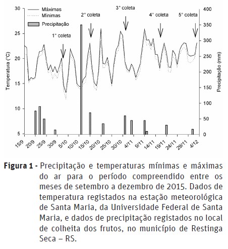 Os dados de temperaturas mínimas e máximas do ar foram registados na estação meteorológica automática, e os dados de precipitação foram medidos no local do ensaio (Figura 1).
