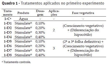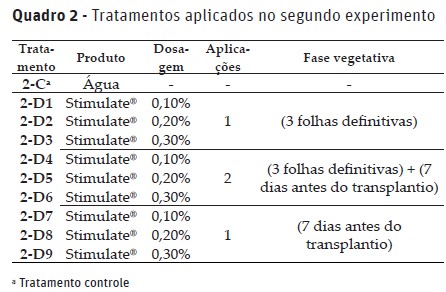 O delineamento experimental utilizado foi o de blocos ao acaso, com 10 tratamentos no primeiro experimento e 9 tratamentos no segundo experimento, com quatro repetições. Os tratamentos (formas de aplicação) estão apresentados no Quadro 1 e 2. O Stimulate® é composto pelos seguintes ingredientes ativos: 0,09 g L-1 de cinetina, 0,05 g L-1 de ácido giberélico e 0,05 g L-1 de ácido 4-indol-3-ibutírico (produto comercializado pela Stoller do Brasil Ltda.).