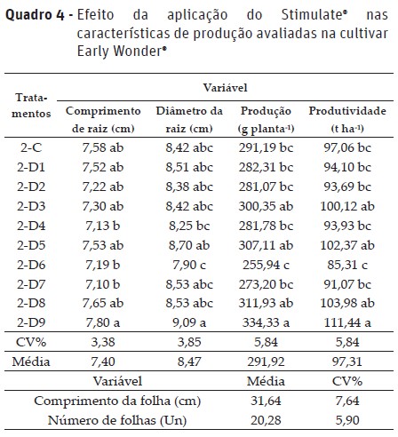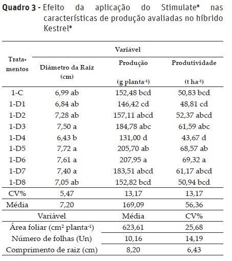 De acordo com os resultados do teste F da análise de variância, verificou-se efeito significativo das doses de Stimulateâ para comprimento e diâmetro da raiz, produção e produtividade. Não foram encontradas diferenças estatisticamente significativas para o número e comprimento das folhas (Quadro 4).