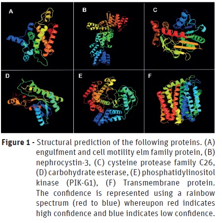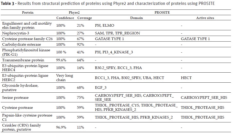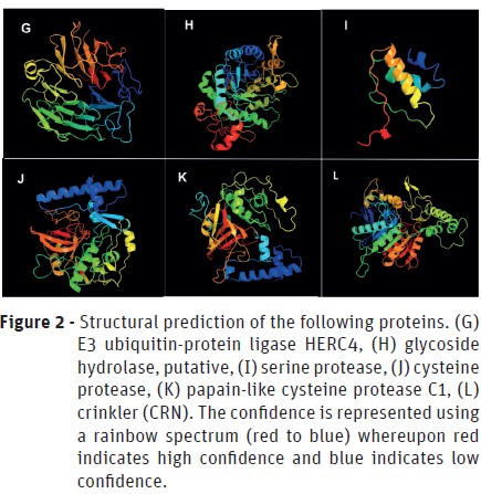 The structural prediction of the proteins found was performed using the Phyre2 (http://www.sbg.bio.ic.ac.uk/~phyre2/html/page.cgi?id=index) server, using the normal modeling mode. For visualization and representation of the structures, we used the Jmol program.