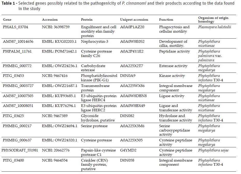 Considering the economic losses caused by P. cinnamomiin European chestnut trees it is extremely important that molecular factors responsible for the pathogenicity of this pathogen are identified. Thus, the aim of this study was to identify genes and its products related to the pathogenicity of P. cinnamomi, as well as the characterization of the results obtained through bioinformatics tools.