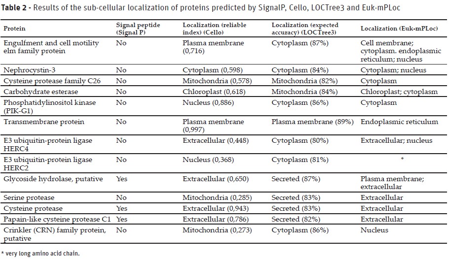 The software SignalP 4.1 (http://www.cbs.dtu.dk/services/SignalP/) was used to analyze the presence of signal-peptide. The following softwares were used to predict the sub-cellular location of proteins: Cello v.2.5 (http://cello.life.nctu.edu.tw/) ; LOCTree3 (https://rostlab.org/services/loctree3/); and Euk-mPLoc 2.0 (http://www.csbio.sjtu.edu.cn/bioinf/euk-multi-2/). Each one analyzes proteins in different ways and for all tools, the selected parameters were: "Eukaryotes" for organism or domain and "Protein" for the type of sequence.